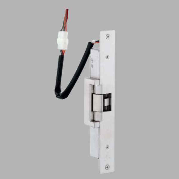 枠に取り付け自動施錠タイプの錠前と組み合わせて使用する電気ストライクです。